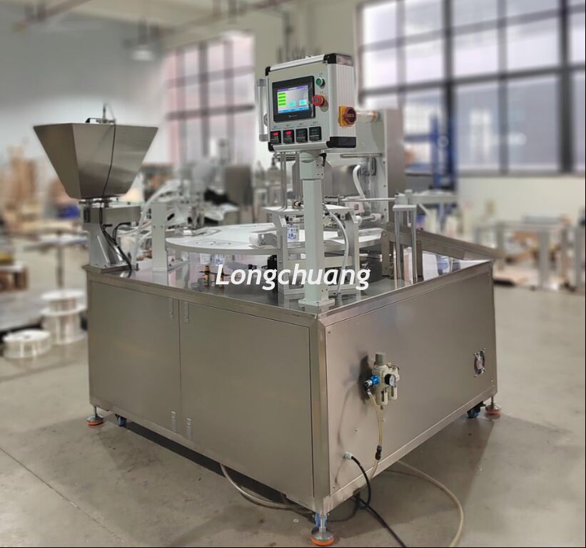 2. Скорость производства: Одноканальный/двухканальный выход: 1000-1200 стаканчиков/час. Рабочий процесс: Автоматическая подача стаканчиков, автоматическое наполнение материалом (погружное наполнение) с бункером для хранения; автоматическое пополнение материала при пустом бункере (опционально), автоматическая термозапайка, автоматическая выдача стаканчиков.